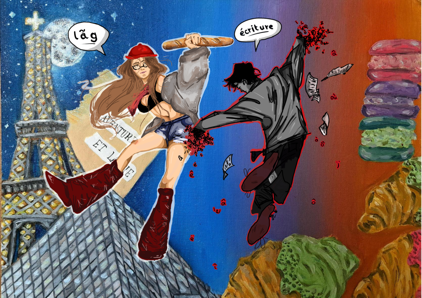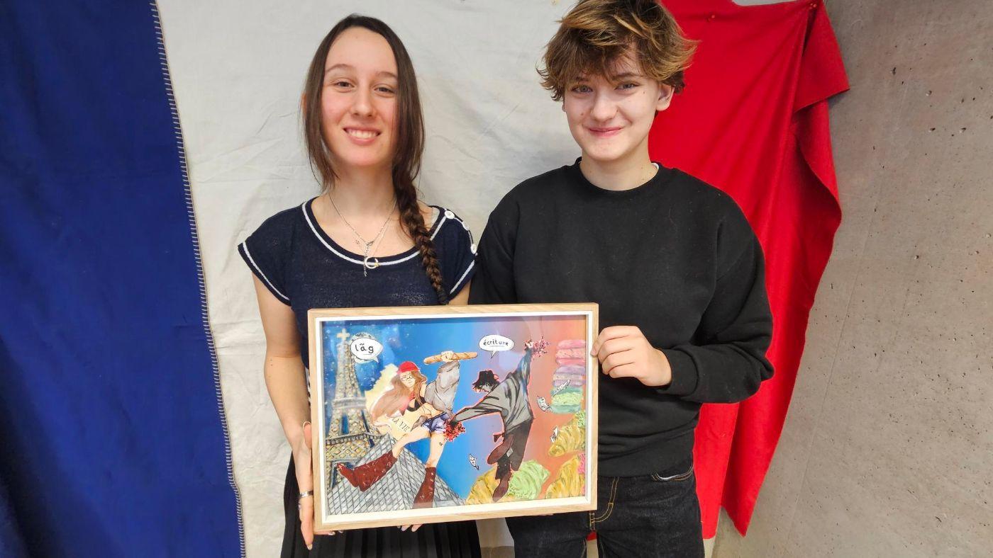 In ihrem Gemeinschaftswerk setzen sich Clara Kurzthaler und Luca Makarow (6 A, 6C) mit der Dualität des Französischen auseinander: dem Unterschied zwischen geschriebener und gesprochener Sprache. Durch die Verbindung von Ölmalerei und digitaler Illustration werden diese beiden Ebenen als eigenständige Figuren dargestellt – unterschiedlich, aber untrennbar miteinander verbunden. Die Künstlerinnen äußern sich wie folgt zu ihrem Werk: „Die beiden Figuren begegnen sich im Raum des Bildes, als würden sie miteinander tanzen oder kommunizieren. Sie stehen für die Idee, dass Sprache nicht nur Mittel zur Verständigung ist, sondern auch Kunst, Identität und Gefühl“ (CK/LM).