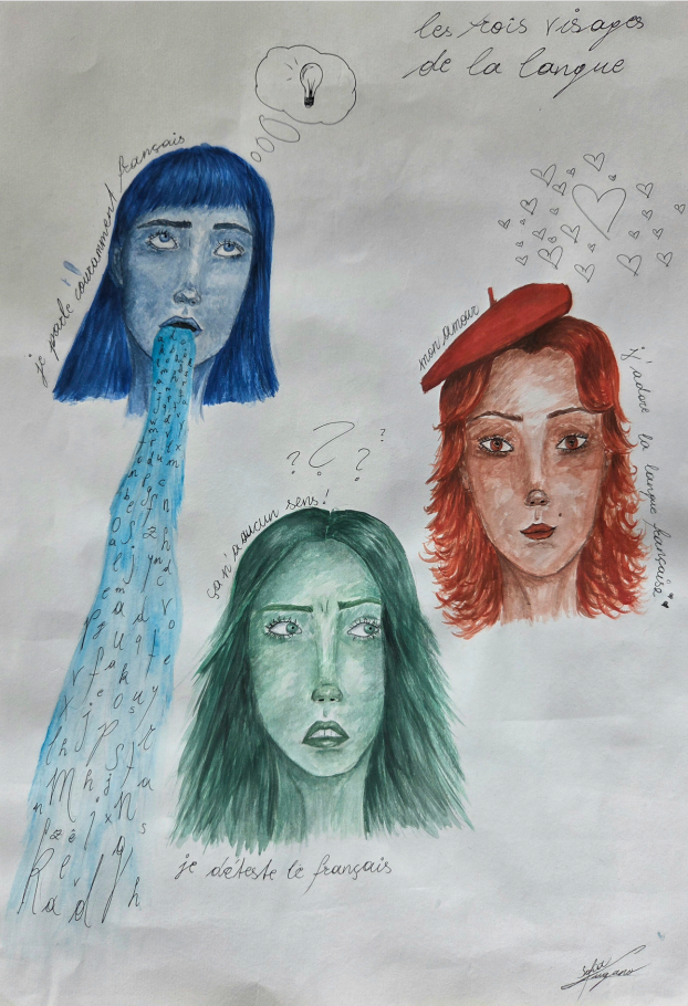 Sofia Lugana (6 A) zeigt in ihrem Werk drei verschiedene Haltungen gegenüber der französischen Sprache: Begeisterung, Ablehnung und Gelassenheit. Das Bild macht deutlich, wie unterschiedlich Sprachenlernen erlebt werden kann und wie stark Gefühle und Aussprache miteinander verbunden sind.